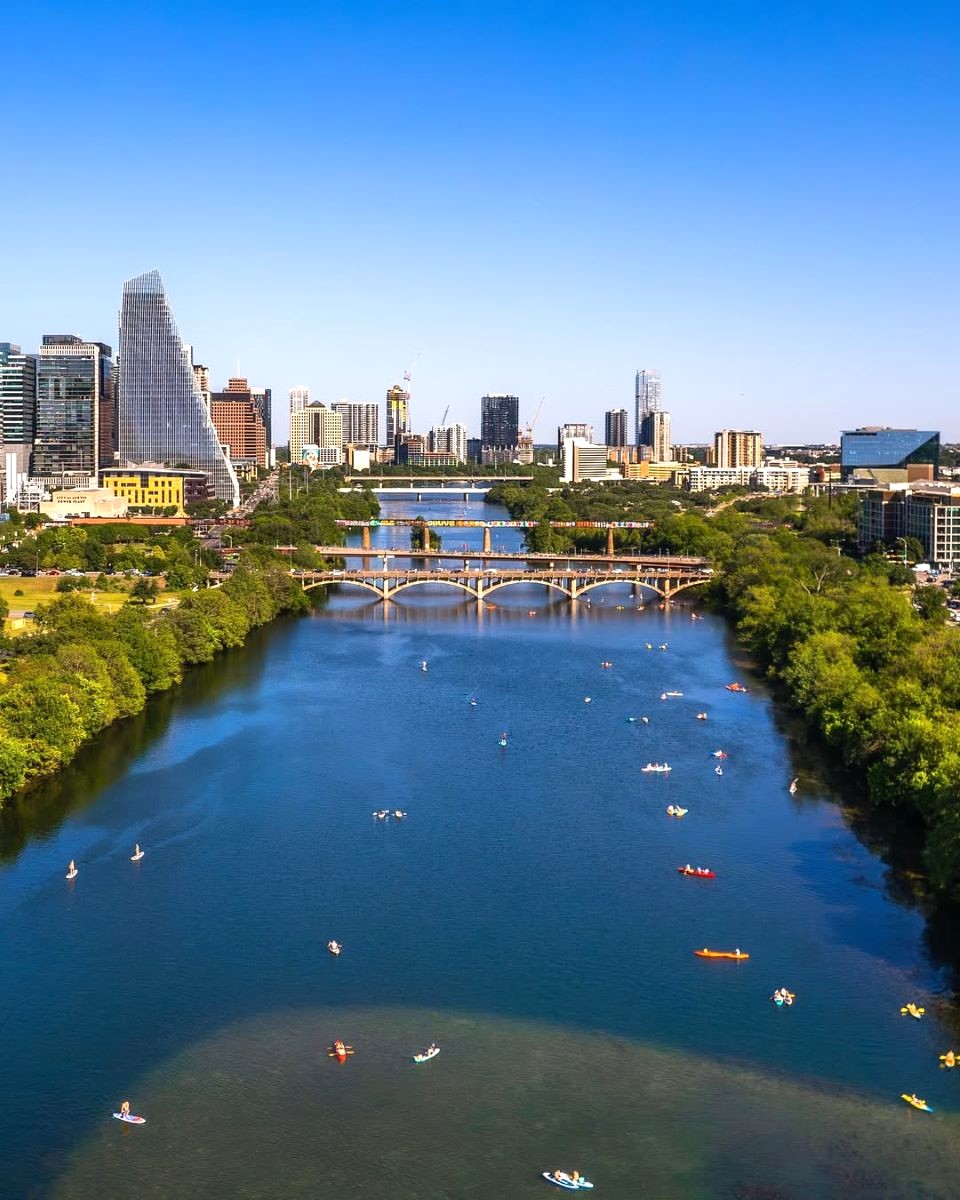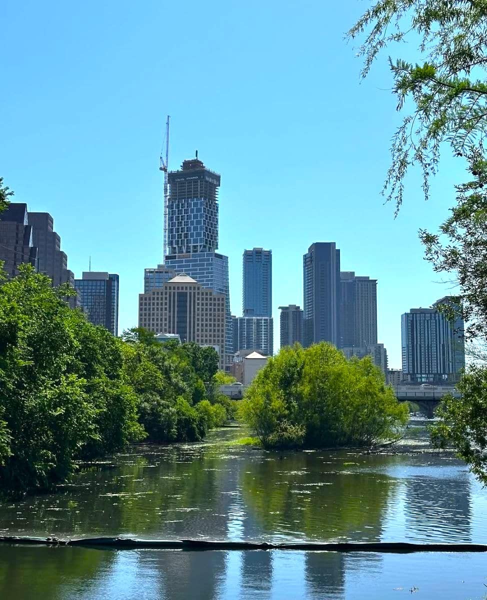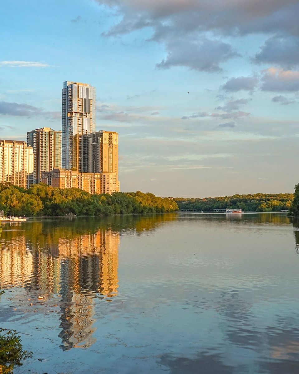 Vista do horizonte. A proximidade da área ao Lady Bird Lake proporciona vistas deslumbrantes do horizonte do centro da cidade, especialmente a partir dos bares e terraços nos telhados. Eu sempre trago visitantes aqui para tirar fotos do pôr do sol com o horizonte de Austin como pano de fundo.