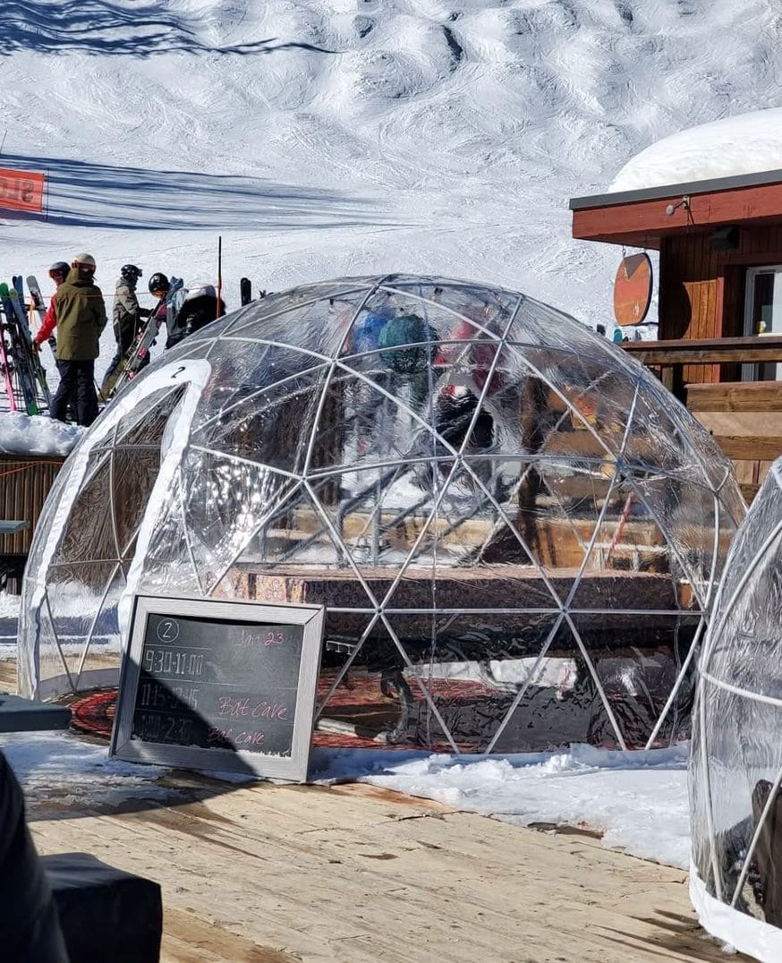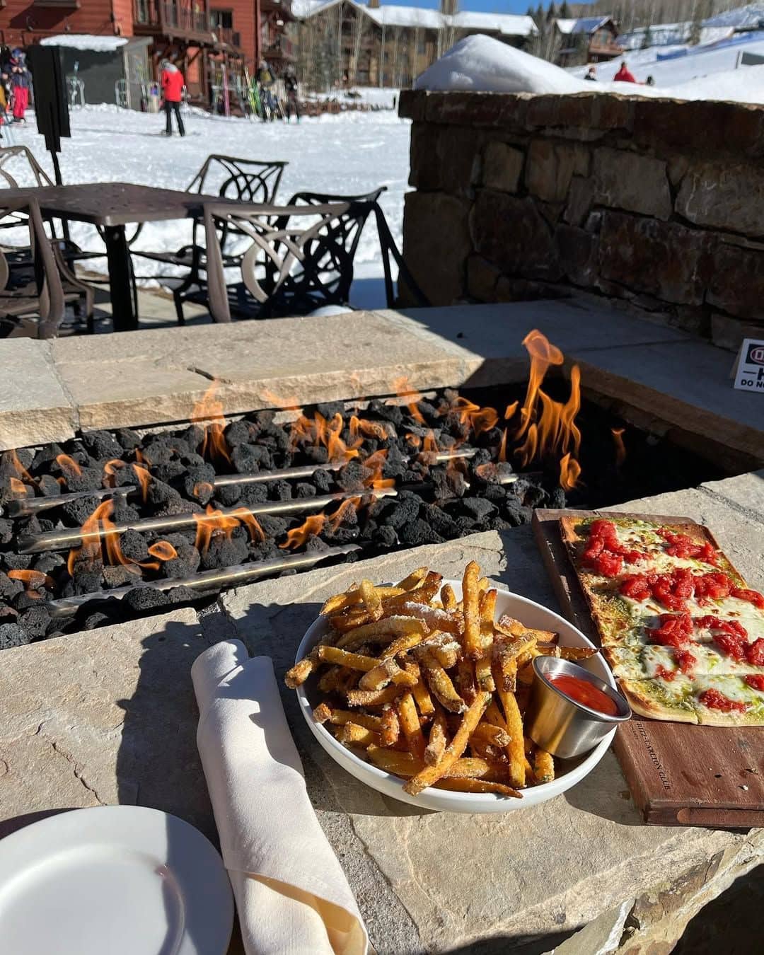Cena pós-esqui. A área da base fica cheia de energia após o horário de esqui, com fogueiras ao ar livre e bares nas montanhas. O deck ao ar livre do Ajax Tavern torna-se um ponto de encontro social onde os esquiadores se reúnem para partilhar histórias das aventuras do dia.