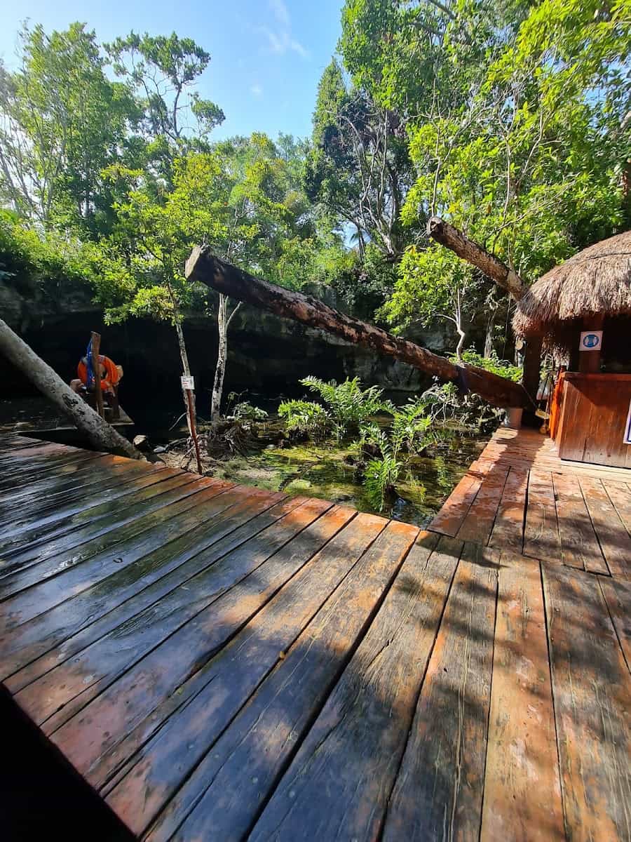 Aventuras nos cenotes. Os cenotes da região são menos movimentados do que os famosos cenotes perto de Tulum. Descobri o Cenote Santa Cruz por acaso, e ele acabou sendo um dos locais mais bonitos para nadar que já vi. A água é tão clara que dá para ver peixes nadando a seis metros abaixo de si.